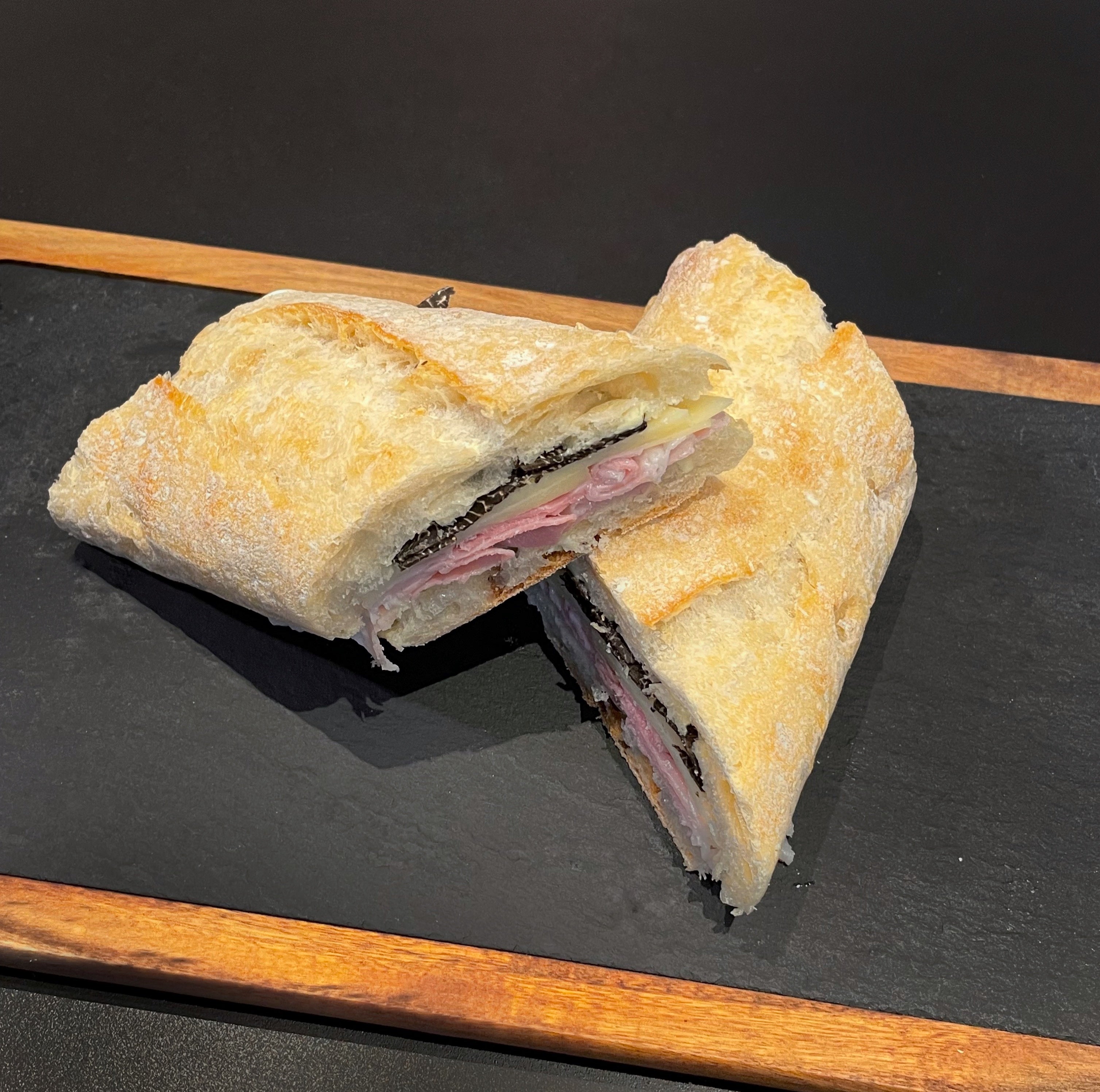Slice the baguette lengthwise. Open it up and generously spread some butter on both sides. Add the slices of ham and cheese. Top with Black Winter Truffle shavings. Close the baguette and slice in two.